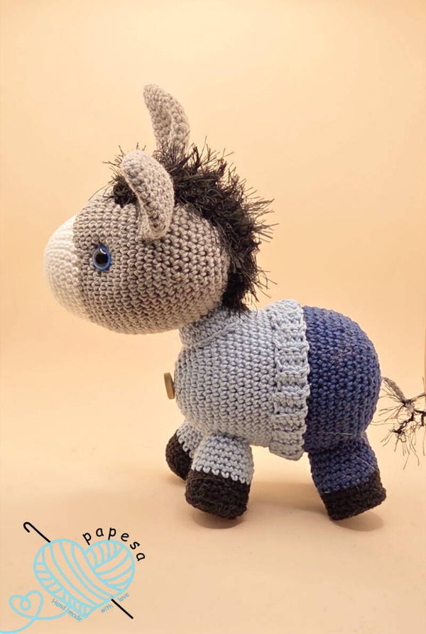 Eberhard der Esel ist ein liebevoll gehäkeltes Amigurumi-Kuscheltier und bereit für sein neues Zuhause.