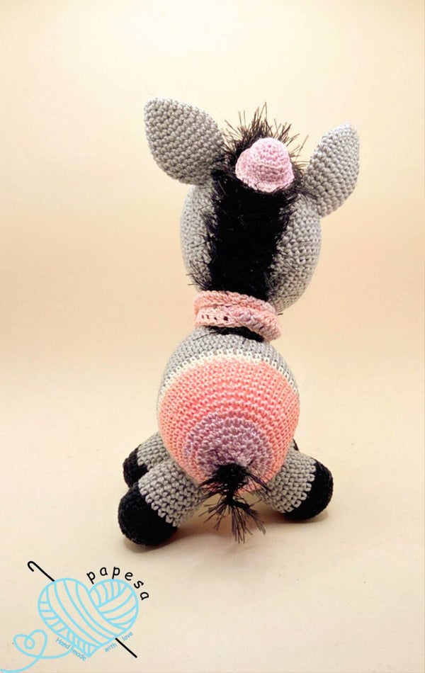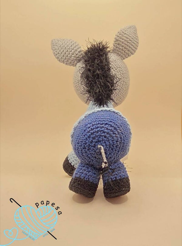 Eberhard der Esel ist ein liebevoll gehäkeltes Amigurumi-Kuscheltier und bereit für sein neues Zuhause.